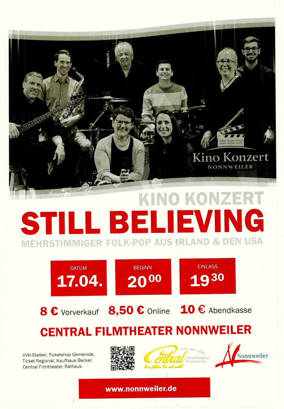 Kino-Konzert mit der Band >Still Believing<, am Freitag, dem 17.April 2026 um 20.00 Uhr, hier bei uns im Central-Filmtheater in Nonnweiler.